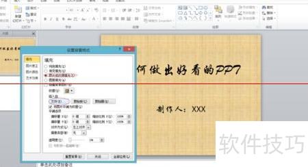 为提升PPT的视觉吸引力,可设置幻灯片背景,根据需要选用纯色、渐变、图片纹理或图案填充方式。此处我采用文件夹中的图片进行填充。需特别注意背景的选择,避免颜色或图案过重导致文字内容模糊不清,影响阅读效果。