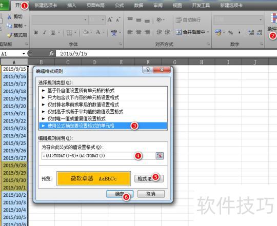 开始 → 条件格式 → 新建规则 → 使用公式 → 输入公式=(A1>TODAY()-5)*(A1