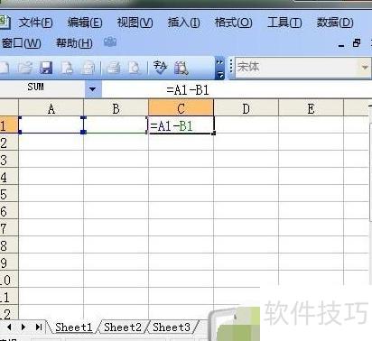 打开Excel表格,选中第一行第三列的C1单元格,在其中输入=A1-B1公式。