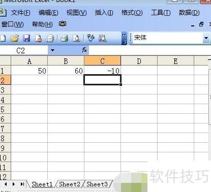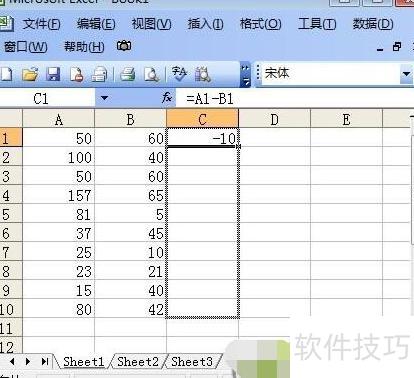 第二步:该公式表示A1减B1等于C1,即第一个单元格的数值减去第二个单元格的数值,结果填入第三个单元格。大家可以试着输入需要计算差值的数字。