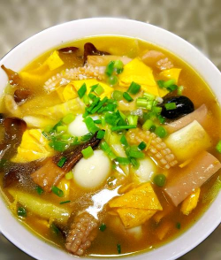 家常大杂烩是一道混合菜肴,常见食材包括猪肚、瘦肉、鱼鱿、鸡腿菇等。制作时将食材切片后煸炒,加入清汤煮制,最后调味即可,简单易上手。
