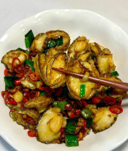 炒鲍鱼做法:鲍鱼肉切片焯水后沥干,青红椒切丁,热锅加油炒鲍鱼丁1分钟,加入青红椒丁翻炒半分钟,调入盐、白胡椒粉,盛入鲍鱼壳即可。大火快炒保持鲜嫩。