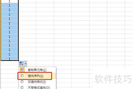 持续下拉鼠标至目标单元格,此时可见内容未递增。随后点击目标单元格右侧的图标,选择以序列方式填充,确认后数据便会按递增顺序自动填充完成,实现连续数值的生成,操作简便且高效。