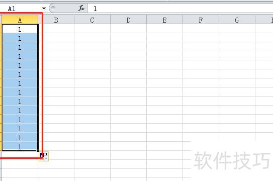 将鼠标置于A1单元格右下角,向下拖动填充,可见所有数值均为1。