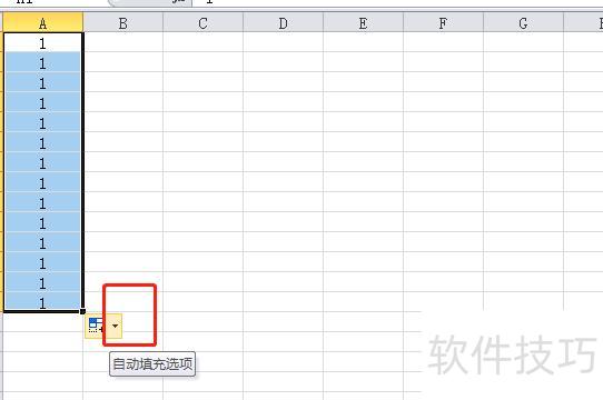 以Excel 2010为例,所示,欲将A1单元格中的数字1向下拖动实现递增填充。将鼠标置于A1单元格右下角,按住并向下拖动,此时所有填充值仍为1。在填充区域右下角会出现一个倒三角图标,点击该图标即可进行后续填充方式的设置。