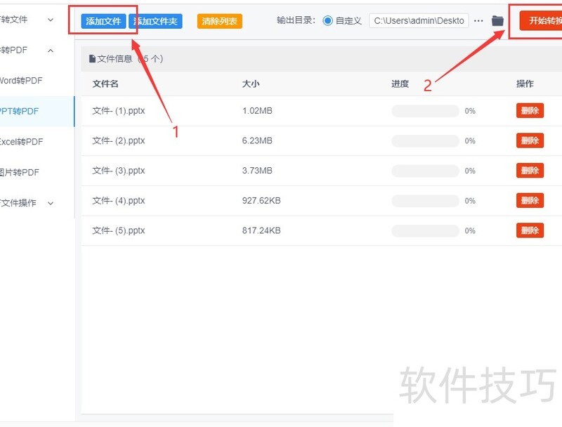 第二步:在文件转PDF的下拉菜单中选择PPT转PDF功能,点击页面上的添加文件按钮,选取需转换的PPT文件并全部导入软件。该软件支持批量上传,可同时对多个文件进行批量转换操作。
