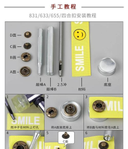 四眼纽扣安装需注意扣面与布料的配合,使用工具时避免压到细弹簧线,保持垂直轻敲,防止扣子变形。