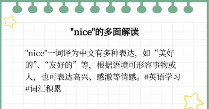nice作为英语形容词,意为“美好的、和蔼的、精细的”,也可作名词使用,指姓氏或人名。在日常交流中,常用于描述人或事物的正面特质。