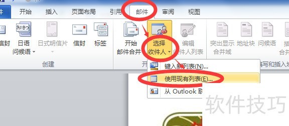 在Word奖状模板中,点击邮件菜单,选择开始邮件合并中的选择收件人,然后从下拉菜单中点击使用现有列表。