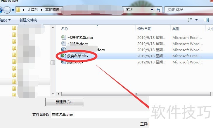 在弹出的选择数据源窗口中,定位到第一步创建的奖状名单.xlsx文件,将其设为数据源,然后点击打开按钮完成操作。