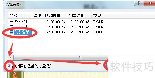 在选择表格对话框中,点击获奖名单工作表,然后单击确定。
