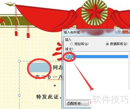 在Word模板中依次选中姓名和奖项区域,点击邮件菜单,选择编写和插入域工具组中的插入合并域选项,操作所示。