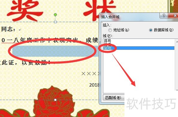 在插入合并域对话框中,选择Excel表格对应的姓名和奖项字段,点击插入,所示。