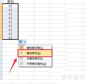 点击红框内的自动填充选项,弹出菜单后选择填充序列即可。