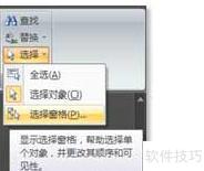 在PowerPoint的开始选项卡中,点击编辑组内的选择按钮,从下拉菜单中选择选择窗格命令,操作所示。