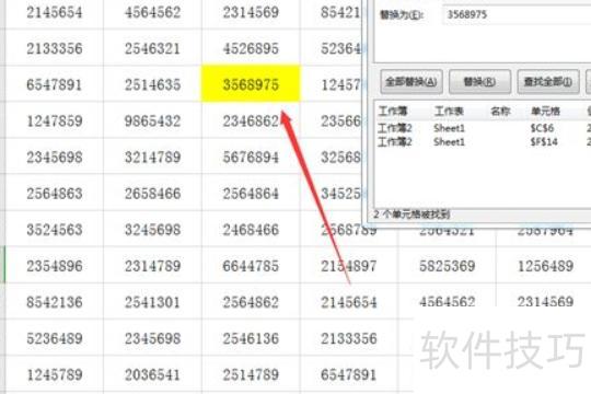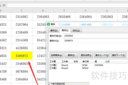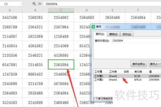 在弹出的对话框中,于查找内容栏输入2565894,点击,下拉列表将显示两条结果,其中首个灰色背景的条目对应表格中带有绿色边框的单元格。