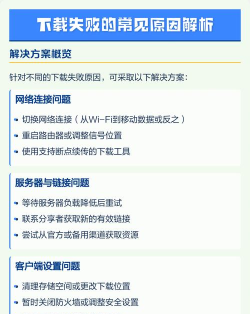 下载失败可能由网络波动、服务器故障或软件设置不当引起,需检查网络稳定性、服务器状态及软件配置。