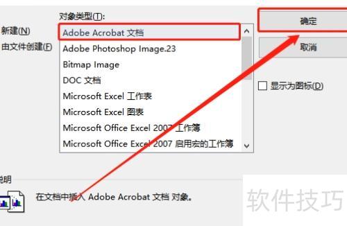 在附件中选择对象,弹出窗口后选中Adobe Acrobat document,确认即可完成操作。