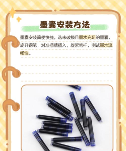 钢笔安装分为墨囊和吸墨两种方式。墨囊钢笔需平行拔出笔盖,取出旧墨囊,插入新墨囊至卡紧;吸墨钢笔需旋转笔身,将墨胆插入笔头,再吸墨至满。具体步骤需根据钢笔类型操作。