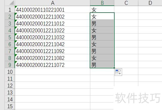 按下回车后,该行身份证性别即成功提取。将鼠标移至公式单元格右下角,出现+符号时,按住左键向下拖动并松开,下方其他身份证号码对应的性别也随之自动提取完成。