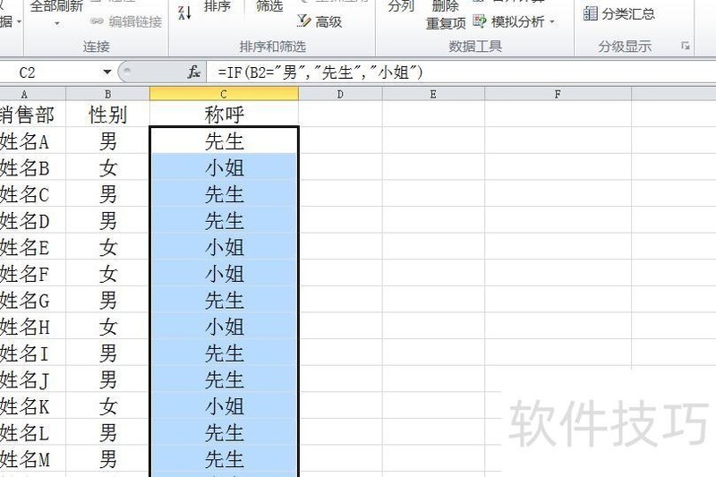 在Excel中,可根据已知性别使用IF函数判断并返回先生或小姐的称呼。