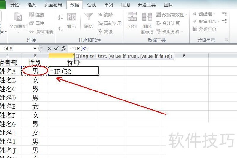 打开需操作的Excel表格,在称呼对应的单元格中输入函数=IF(,接着点击性别所在的单元格(如B2,可根据实际数据调整单元格位置)。