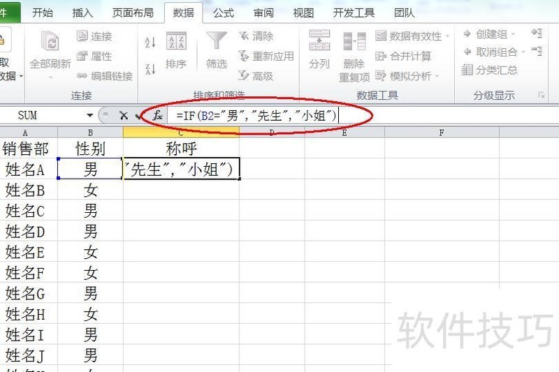 在函数编辑框中继续输入=男,先生,小姐),按回车键完成公式输入。其中男为判断条件,若条件成立,单元格显示先生,否则显示小姐。