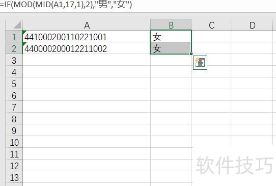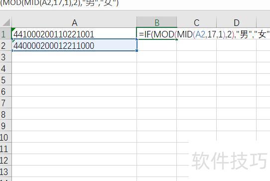 在身份证号码所在行的下一单元格输入公式:=IF(MOD(MID(A1,17,1),2),男,女),其中A1为身份证号单元格位置,按回车即可得出性别结果。