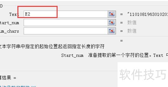 调出函数公式,选取第一个参数,即E2单元格的身份证号码。