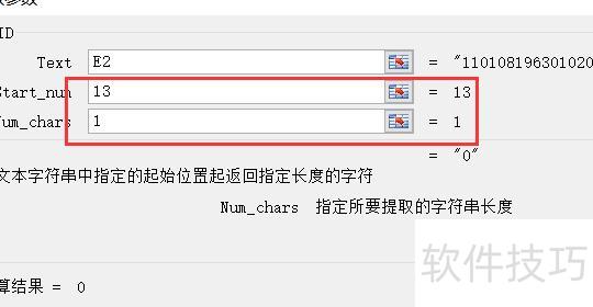 通过身份证号倒数第二位判断年龄,取第13位字符作为依据,因此第二个参数设为13,需提取1位数,故第三个参数填1。