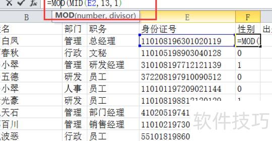 在公式=IF(MOD(MID(A1,17,1),2),男,女)中,通过MID函数提取A1单元格第17位字符,并利用MOD函数判断该数字的奇偶性。MOD函数用于计算余数,当该位数字除以2余数为1时,表示其为奇数,返回男;若余数为0,则为偶数,返回女。公式中,男对应奇数(即余数为1),女对应偶数(即余数为0)。因此,若提取的数字为奇数,该单元格将显示男,反之则显示女。此方法常用于根据身份证号码第17位判断性别。