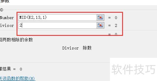 在编辑框中,于MID函数前输入MOD(,用于插入条件判断的整除函数。