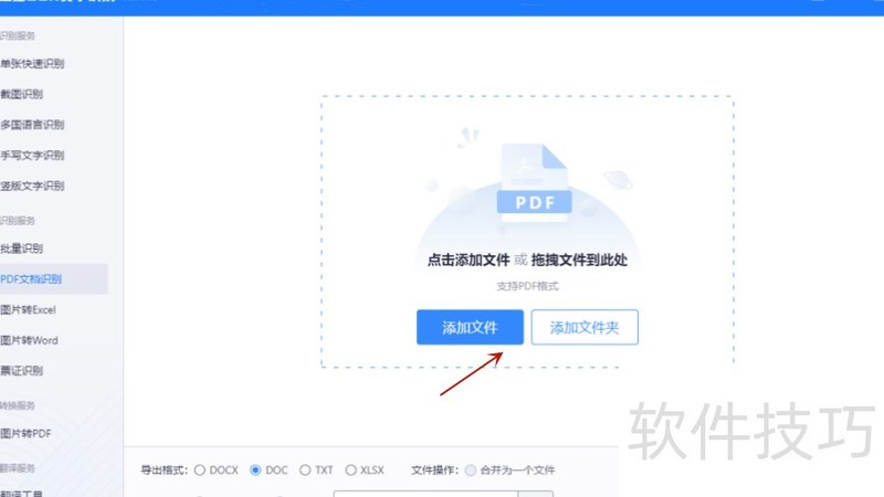 首先,在电脑上打开该软件,于左侧菜单选择PDF文档识别功能,随后即可上传待转换的PDF文件,支持直接拖拽至虚线区域或点击添加文件按钮完成上传操作。