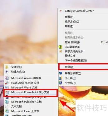 在电脑桌面空白处右击,选择新建,再点击PowerPoint演示文稿,即可创建一个新的PPT文件,所示。