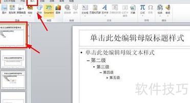 点击PPT主题母版,即第一张模板,在工具栏中选择插入按钮,操作所示。