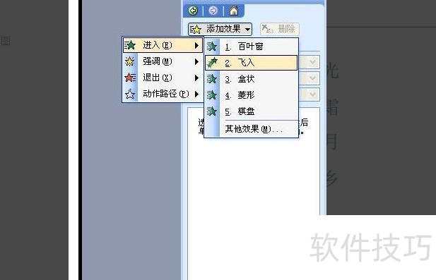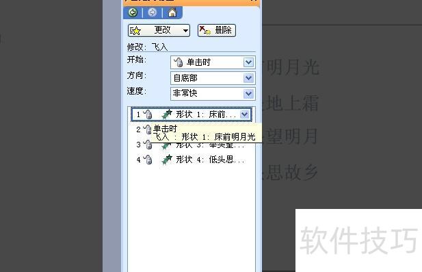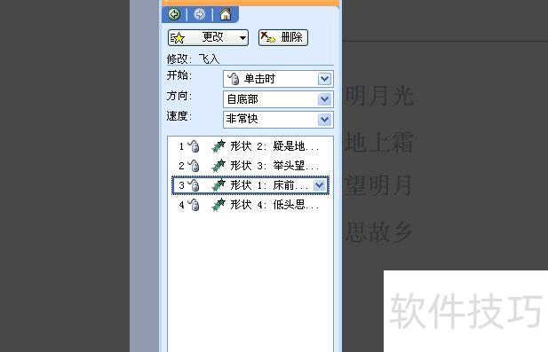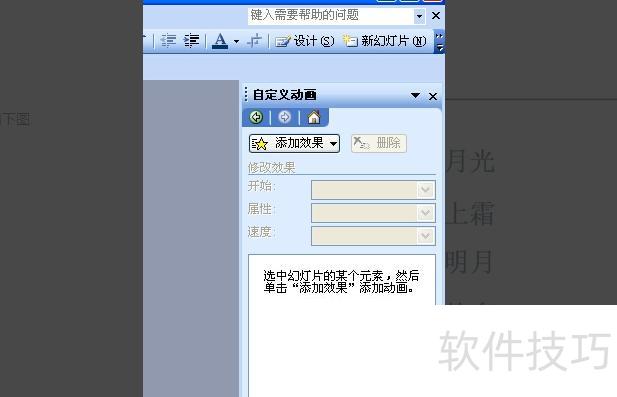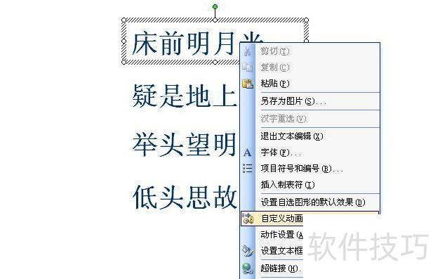 选中床前明月光文字,右键点击,选择自定义动画进行设置。