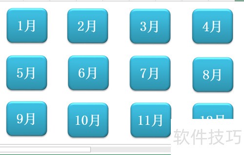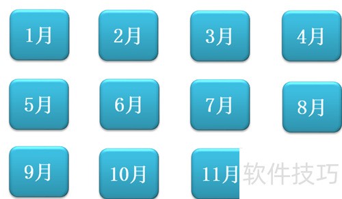 复制11个相同圆角矩形,整齐排列,依次将上方文字改为2月、3月……直至12月,布局所示。