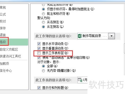 进入→→,在此工作簿的显示选项中取消勾选显示工作表标签即可。