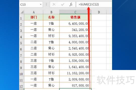 输入公式=SUM(C2:C12)即可得出C2至C12区域的求和结果。