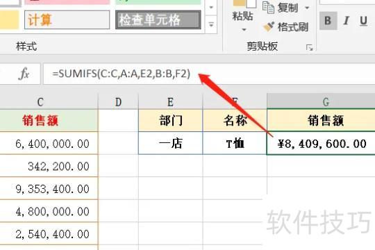 通过SUMIFS函数,按指定条件区域和对应条件对数据求和,语法为:SUMIFS(求和区域, 条件1区域, 条件1, ..., 条件N区域, 条件N)。