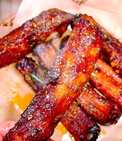 蜜汁烤肋排--肉食者的最爱!它不单色泽诱人,更是色香味俱全,每一口都是满满的幸福!绝对是宴客的一道佳肴. 用料: 主料:带点肥肉的猪肋排骨约4斤,生抽30克,叉烧酱 30克,柱候酱30克,南乳3块,蚝油20克,料酒20克, 细砂糖20克,孜粉粉5克,沙姜粉4克,葱5根,姜片适量,大蒜适量, 扫面材料:蜂蜜适量,叉烧酱适量