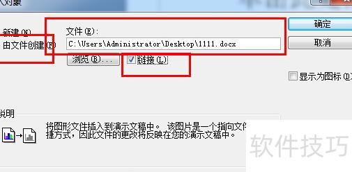 第三步:在第二步弹出的窗口中点击由文件创建,选择要插入的Word文档,最后勾选链接选项。