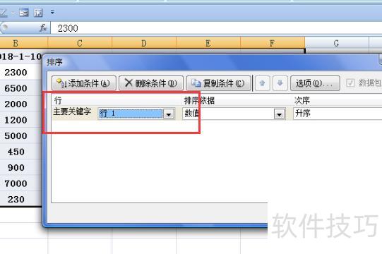 返回对话框,选择主要关键字为行1,排序依据设为数值,次序选升序,确认设置无误后点击按钮完成操作。
