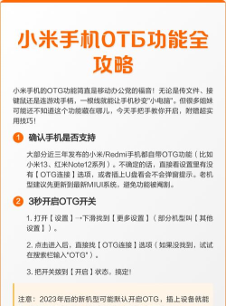 OTG功能允许手机连接外部设备,如U盘、键盘等。需打开手机设置中的OTG选项,并搭配OTG数据线使用,部分手机支持自动开启。