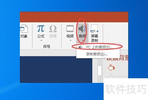 打开PowerPoint,新建空白演示文稿。点击插入选项卡,在媒体组中点击音频下拉按钮,选择PC上的音频。在弹出的对话框中选中所需音频文件,点击插入。插入后可对音频图标进行适当调整与排版,完成设置。
