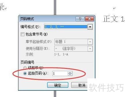 在页码格式对话框中将起始页码设为1,点击确定即可。