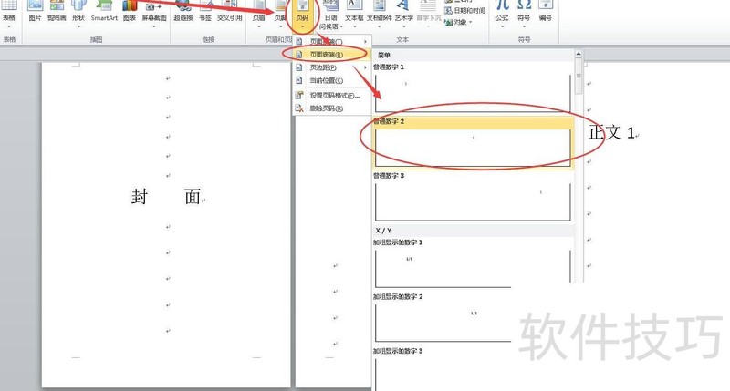 第三步:将光标移至第3页,点击插入菜单,选择页眉和页脚工具组中的页码命令,点击下拉菜单中的页面底端,然后在页码样式中选择普通数字2,即可在页面底部中央插入页码。