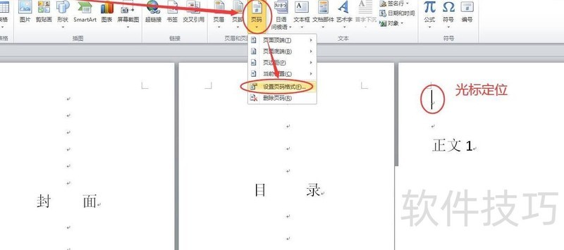 第二步:将光标移至第3页行首,点击插入菜单,选择页眉和页脚工具组中的页码,然后点击下拉列表里的设置页码格式选项,操作所示。