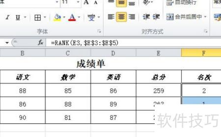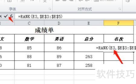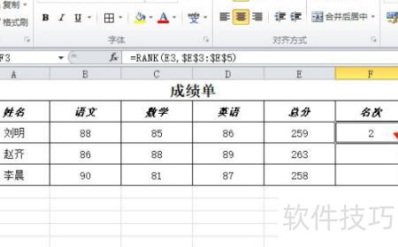 在F3单元格输入=RANK(E3,$E$3:$E$5),随后点击确认输入。