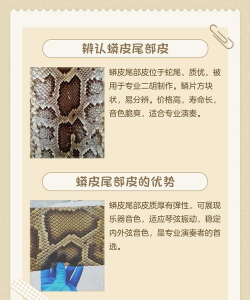 蛇皮或蟒皮常用于二胡琴筒的制作,影响音色表现,但蛇皮质地较薄,音色较差,因此蟒皮更受推崇。